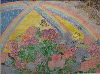 F30号に細かい貼り絵を制作するのは時間もかかり約6ヶ月から8ヶ月の集中力が必要である。花の部分と空の部分は色彩も大変深みを増し見事な大作となった。本人は黙々と貼り絵を続け生きる事が制作することに直結している。心の中の心象風景も合わせて見る事の出来る作品である。