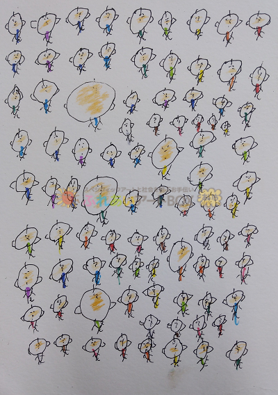 手早く、柔らかいタッチで描かれる人間たち、偶発的に置かれた目や口の位置によって表情が違って見える。