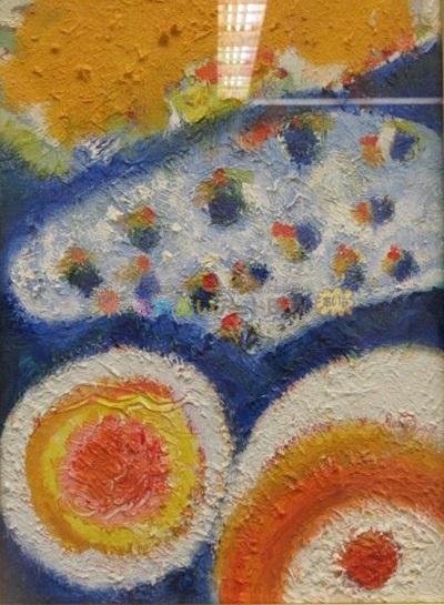 丸や△、□などを組み合わせて全国的にも有名な一宮のモーニングを表現したものである。油彩で何回も重ね塗りをしている色彩の明るさ、目玉焼きの丸などおいしそうで暖かい雰囲気が出ている。単純であるが、アットホームな作者の心がにじみ出ている作品である。