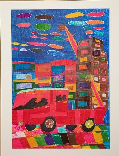 高等部の修学旅行で、東京都足立区の消防署に行った時に見た、赤い消防自動車です。白い救急車もありましたが、消防車にしました。雲や窓は好きな色にしました。