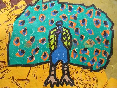 インドにいる孔雀。色あざやかでひろげた羽の真ん中に立っているインドの鳥。
