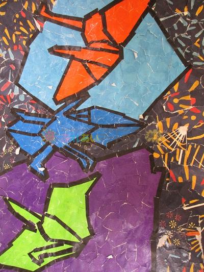 折り鶴は、色とりどりで折り紙で作られた鶴。鹿児島県出水におる鶴みたい。千羽鶴みたい。